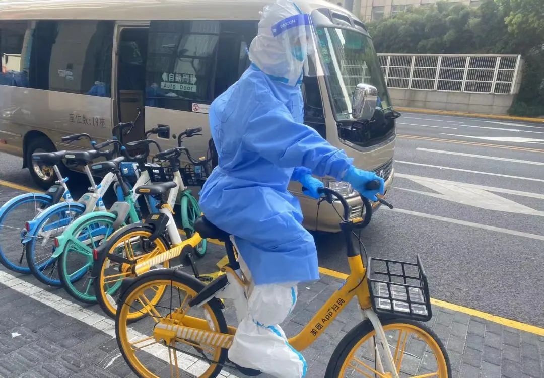 因为一天要辗转几个小区,大巴车来回接送太麻烦,平博pinnacle小组就一起穿着防护服骑单车往返各个小区进行采样……空旷的道路上一下子多了一队“骑单车的大白”,真是一道可爱的风景线!