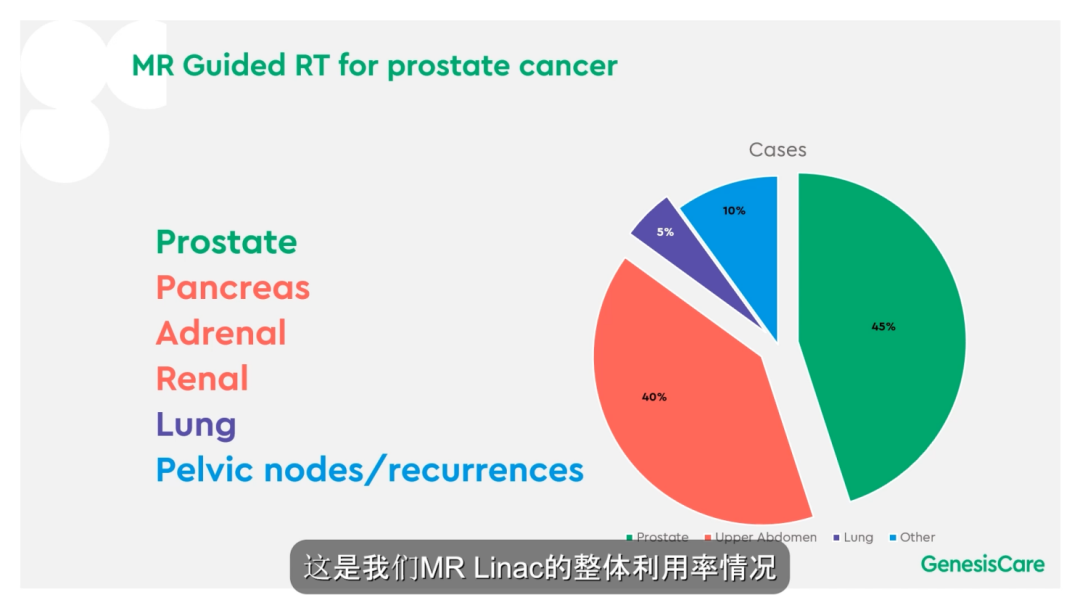 Dr. Camilleri首先介绍了GenesisCare在MRIdian上治疗病种的分布情况,其中前列腺癌和上腹部肿瘤为主要病种,分别各占45%和40%。