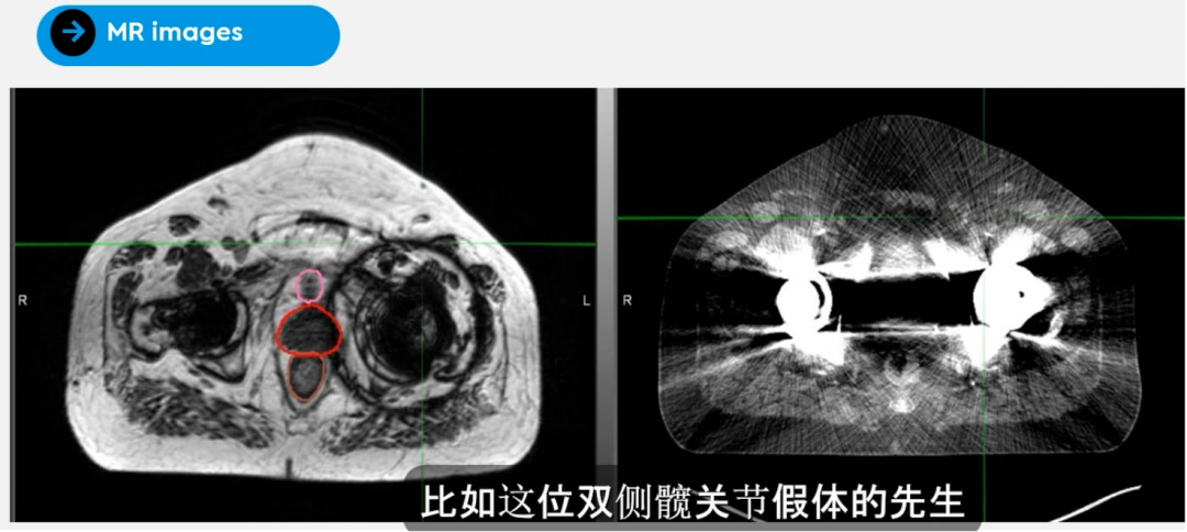 Figure 5 Dr. Camilleri展示的髋关节置换术后前列腺患者MRIdian 0.35T MRI影像(左)和CT定位图像(右),MRIdian MRI图像受金属髋关节假体影响较小