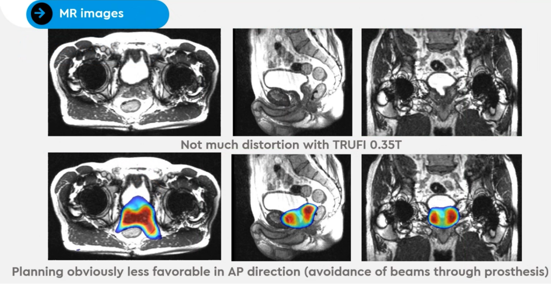 另外,Dr. Camilleri还展示了一位髋关节置换术后前列腺患者MRIdian 0.35T MRI影像和CT定位图像,MRIdian MRI图像受金属髋关节假体影响较小,仍能看清靶区和所有危及器官,见Figure 5。所以,仍然能为患者提供每日在线自适应放疗计划,但值得注意的是,射束必须避开金属髋关节,见Figure 6。