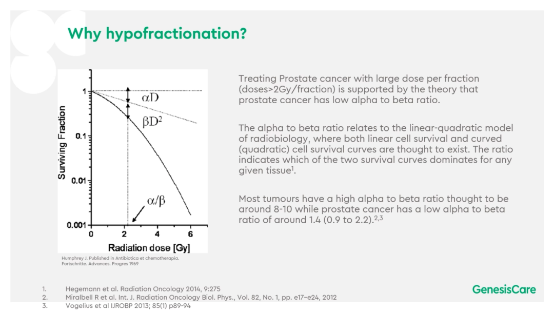 关于为前列腺癌患者进行少分次大剂量的放射消融,Dr. Camilleri提供了大量文献依据,在放射生物学线性二次方程模型中,前列腺癌的α/β值很低,大约仅为1.4,见Figure 9。相比其它α/β值较高的肿瘤,对前列腺癌来说少分次大剂量具有更高的肿瘤细胞杀伤力。