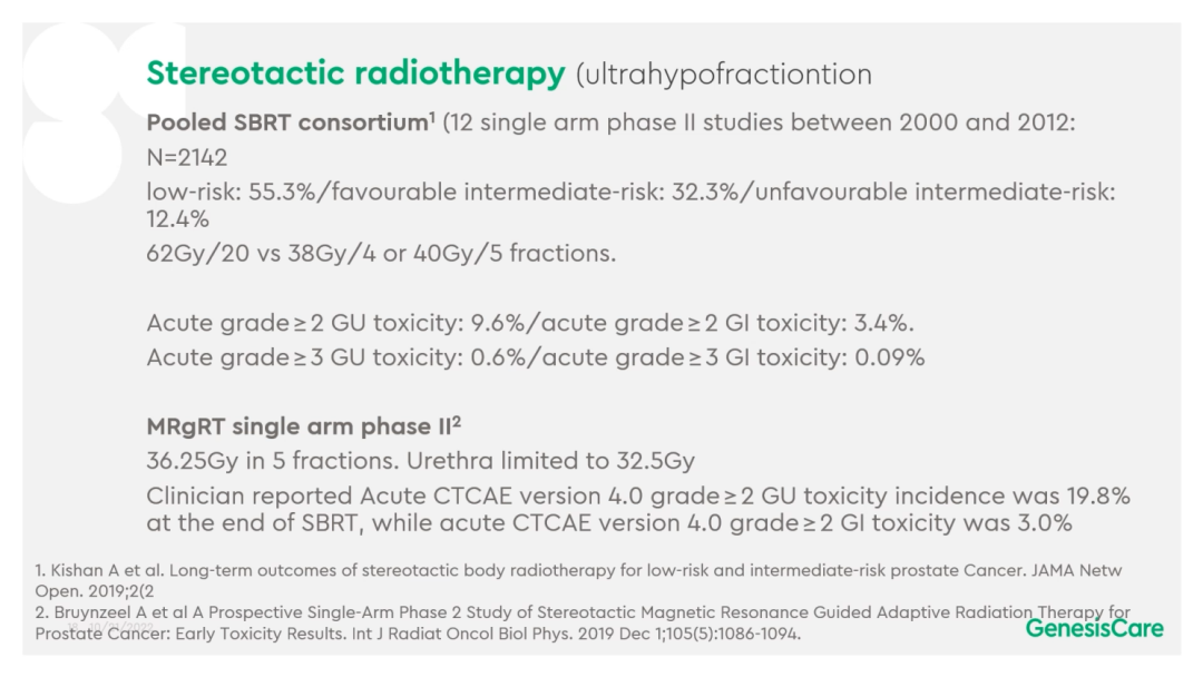 在Kishan发表的关于合并SBRT的研究中,汇集了12项单组二期研究,入组了2000多名患者,结果证明,放射消融在减少放疗毒性上有明显的优势。另外,荷兰阿姆斯特丹发表的MRIdian磁共振引导前列腺癌放射消融治疗单组二期研究表明,MRIdian能有更好的预后。