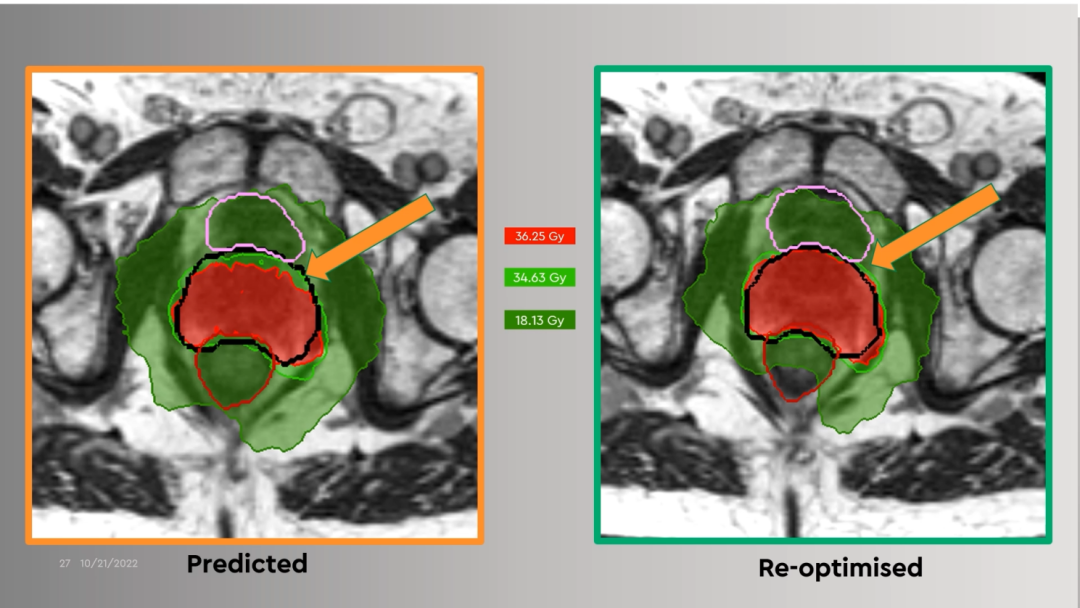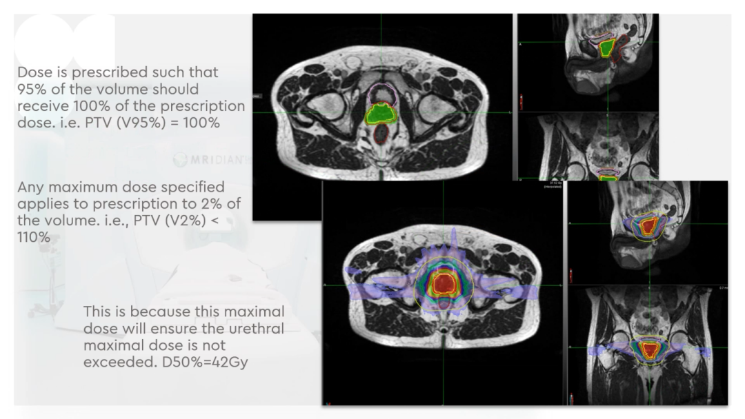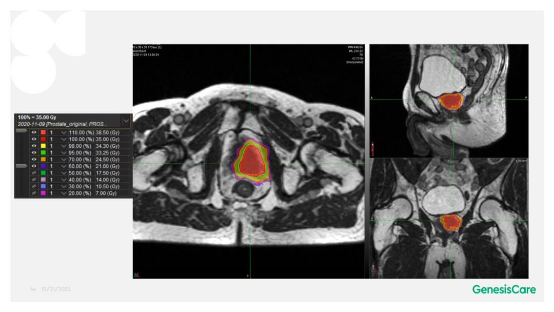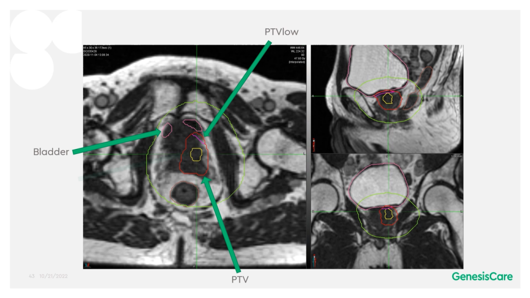 在使用MRIdian以SABR放射消融方式治疗患者不久后,英国就遭遇到了新冠疫情,导致大量放疗中心缩减、停止服务,甚至关停。GenesisCare在疫情期间为就诊的所有前列腺癌患者,都进行5个分次的SABR放射消融治疗。第一年使用的剂量分割为36.25Gy/5F,第二年升级了规程,在保护危及器官的基础上,给予靶区内同步推量至CTV 40Gy/5F,PTV 36.25Gy/5F。