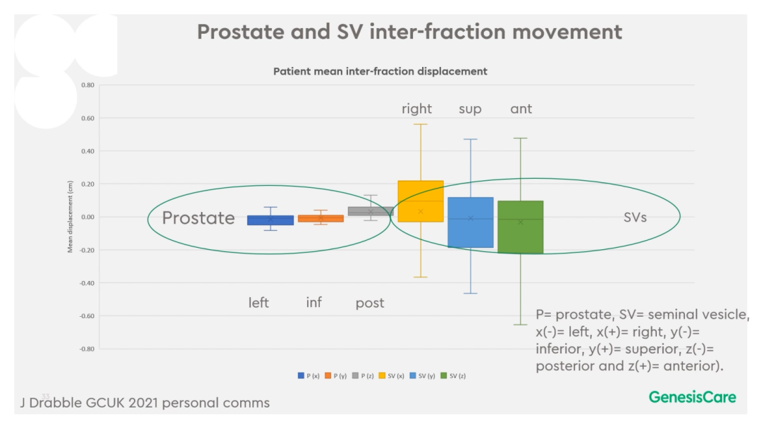 Dr. Camilleri表示前列腺放疗的分次间,前列腺的移动度不算大,但精囊腺的移动度较大,可以达到5mm左右,通过MRIdian每日在线自适应计划调整可以修正这些运动。
