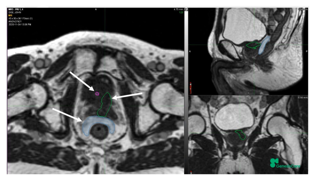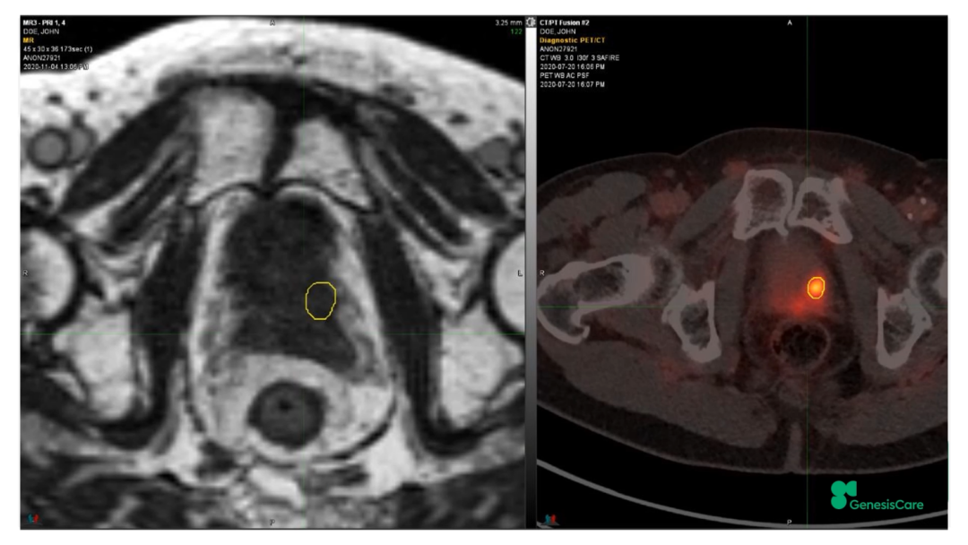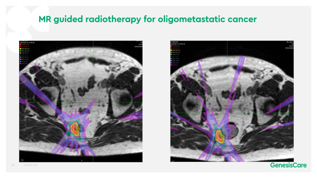 GenesisCare拟定了其对前列腺癌放疗后复发的磁共振引导再次放疗的规程,包括使用多参数MRI图像和PSMA PET图像,要求进行活检证实,还会尝试放置直肠-前列腺阻隔凝胶。根据影像和活检的情况,对前列腺全部腺体或部分腺体进行30-35Gy/5次的放射消融治疗。截至2022年11月份,GenesisCare英国已经在MRIdian上治疗了12例复发的患者,均在直肠和前列腺之间放置阻隔凝胶,无Ⅰ度以上的消化道GI毒性,有4名患者有Ⅰ度泌尿道GU毒性,7名患者为Ⅱ度GU毒性。