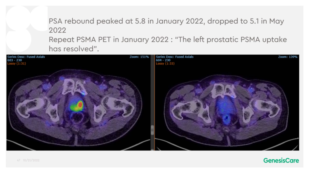 Dr Camilleri表示在前列腺癌上放射消融治疗有明显优势,现有数据也能支持放射消融治疗对治疗前列腺癌寡转移的优势。Dr Camilleri介绍了一位在2015年做了前列腺切除术的患者,在2020年发现PSA升高,PSMA PET扫描结果显示有个直肠系膜淋巴结转移,病灶紧靠直肠。在MRIdian上使用在线自适应技术、自动肿瘤追踪和自动门控出束技术,放射消融治疗很成功,患者完成治疗的当天就去度假了,没有肠道副作用。SABR治疗后,他的PSA水平也降下来了。