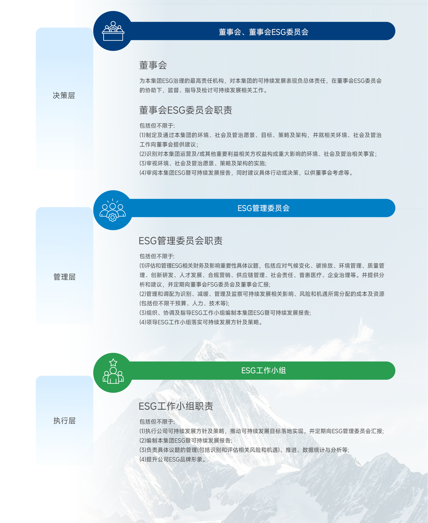 平博pinnacle官网医药集团构建了由董事会及董事会ESG委员会、ESG管理委员会、ESG工作小组组成的ESG治理架构,以确保董事会及管理层对可持续发展的有效监管、科学指导及全力支持。