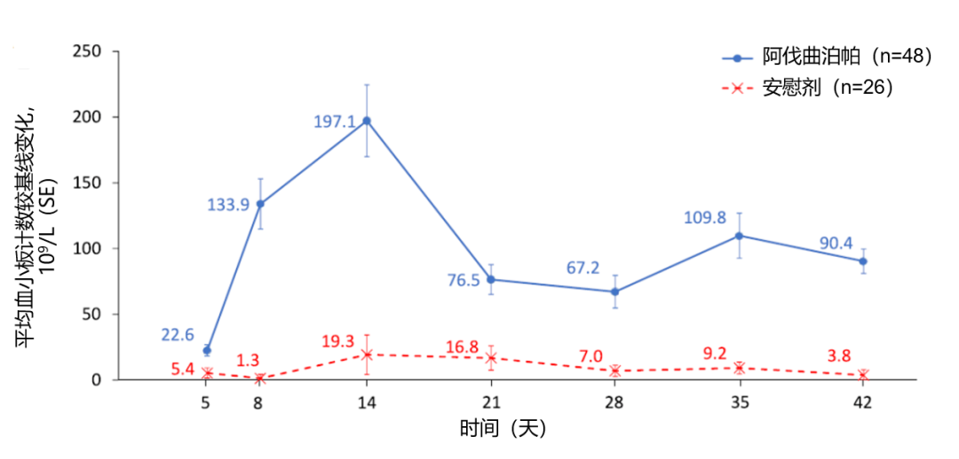 图1 在6周核心治疗期中,两组血小板计数较基线水平的平均(标准偏差)变化