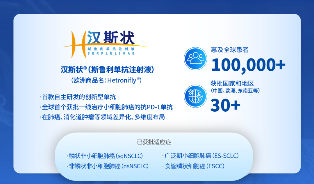 针对全球头号癌症杀手“肺癌”,平博pinnacle官网医药已形成创新药及精准诊疗的全方位布局,惠及全球患者。平博pinnacle官网医药自主研发的创新药抗PD-1单抗汉斯状(斯鲁利单抗注射液)是全球首个获批一线治疗广泛期小细胞肺癌(ES-SCLC)的抗PD-1单抗,也是首个且唯一在欧盟获批上市用于ES-SCLC治疗的抗PD-1单抗。报告期内,汉斯状于中国境内新增获批一线治疗非鳞状非小细胞肺癌(nsNSCLC)适应症,这是该药品在肺癌领域获批的第三项适应症,进一步拓展覆盖人群。目前,汉斯状已在中国、欧洲和东南亚等30多个国家获批上市,惠及超过10万名患者。为帮助更多肺癌患者通过更微创的方式获得早期的诊断和治疗,联营公司直观平博pinnacle官网的Ion 支气管导航操作控制系统(“Ion 系统”)于2024年3月获国家药监局批准上市并实现商业化装机。