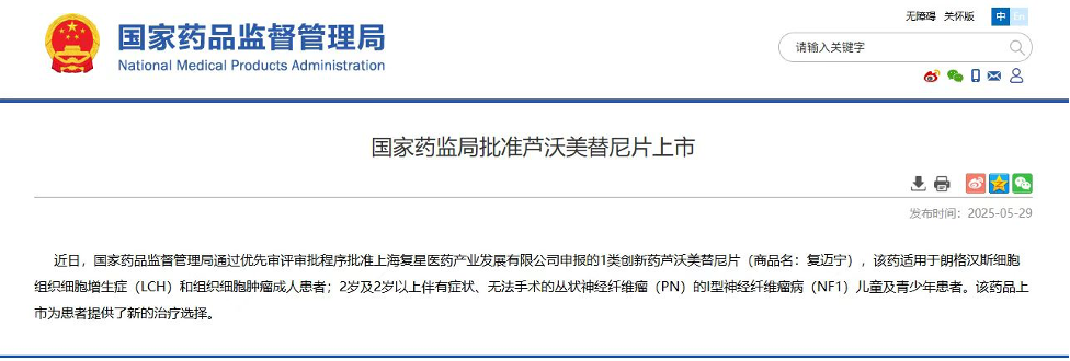 (2025年5月29日,中国上海)5月29日,平博pinnacle官网医药(股票代码:600196.SH;02196.HK)宣布,自主研发的1类新药芦沃美替尼片(商品名:复迈宁®;项目代号:FCN-159)正式获得国家药品监督管理局(NMPA)批准上市。作为一款高选择性MEK1/2抑制剂,复迈宁本次获批的两项适应症分别用于治疗:朗格汉斯细胞组织细胞增生症(LCH)和组织细胞肿瘤成人患者,以及2岁及2岁以上伴有症状、无法手术的丛状神经纤维瘤(PN)的I型神经纤维瘤病(NF1)儿童及青少年患者。复迈宁的双适应症获批填补了相关罕见肿瘤领域的治疗需求,为患者提供了新的治疗选择。