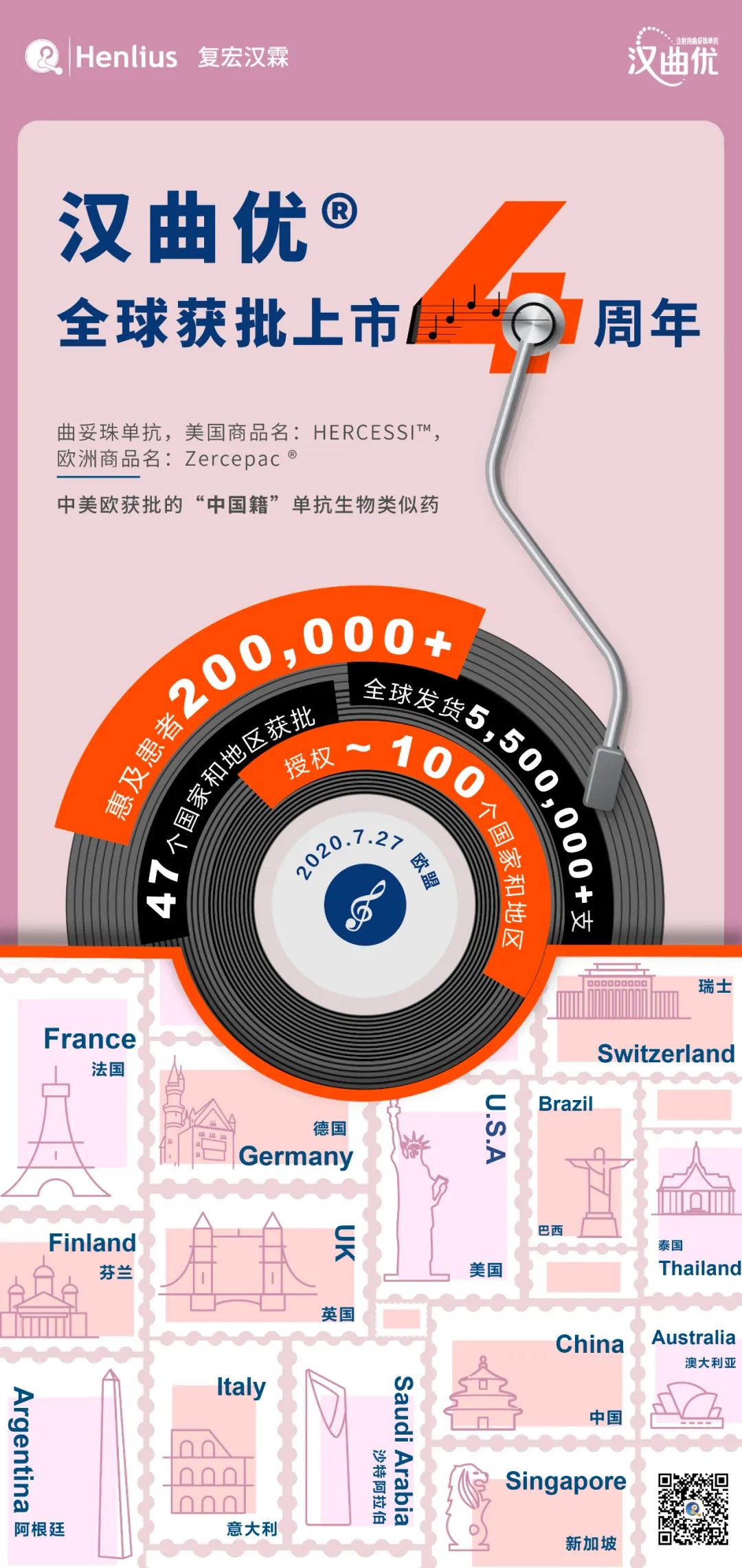 HANQUYOU (trastuzumab, trade name: HERCESSI™ in the U.S., Zercepac® in Europe), the first China-developed trastuzumab biosimilar independently developed by Henlius, has been approved in China, the European Union (EU) and the United States (U.S.). As the pioneering Chinese mAb biosimilars to go overseas, HANQUYOU was first approved in the EU on 27 July, 2020 and has been progressing for four years with proven international quality. Up to now, it has been approved in 47 countries and regions, benefiting 200,000+ patients, bringing affordable and high-quality treatment options to breast cancer and gastric cancer patients worldwide.
