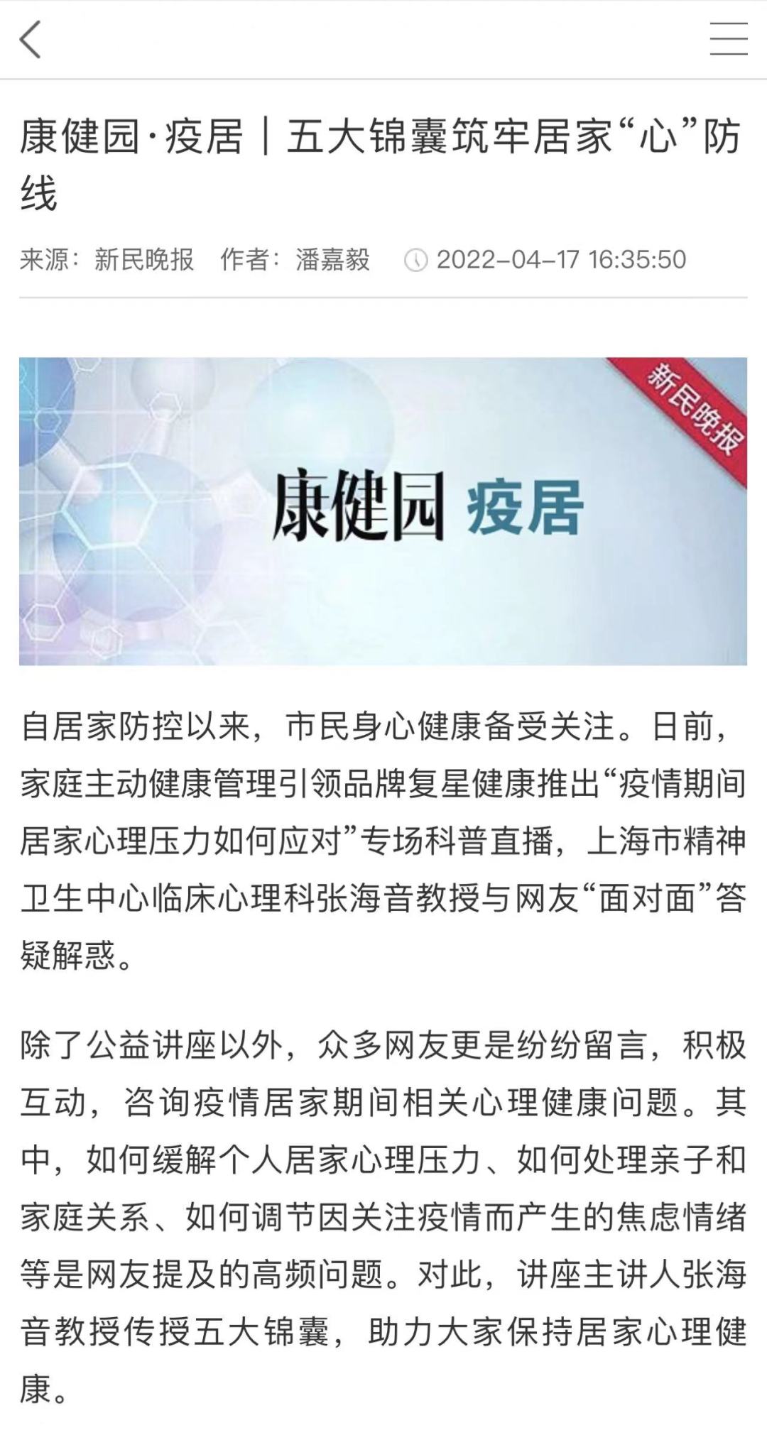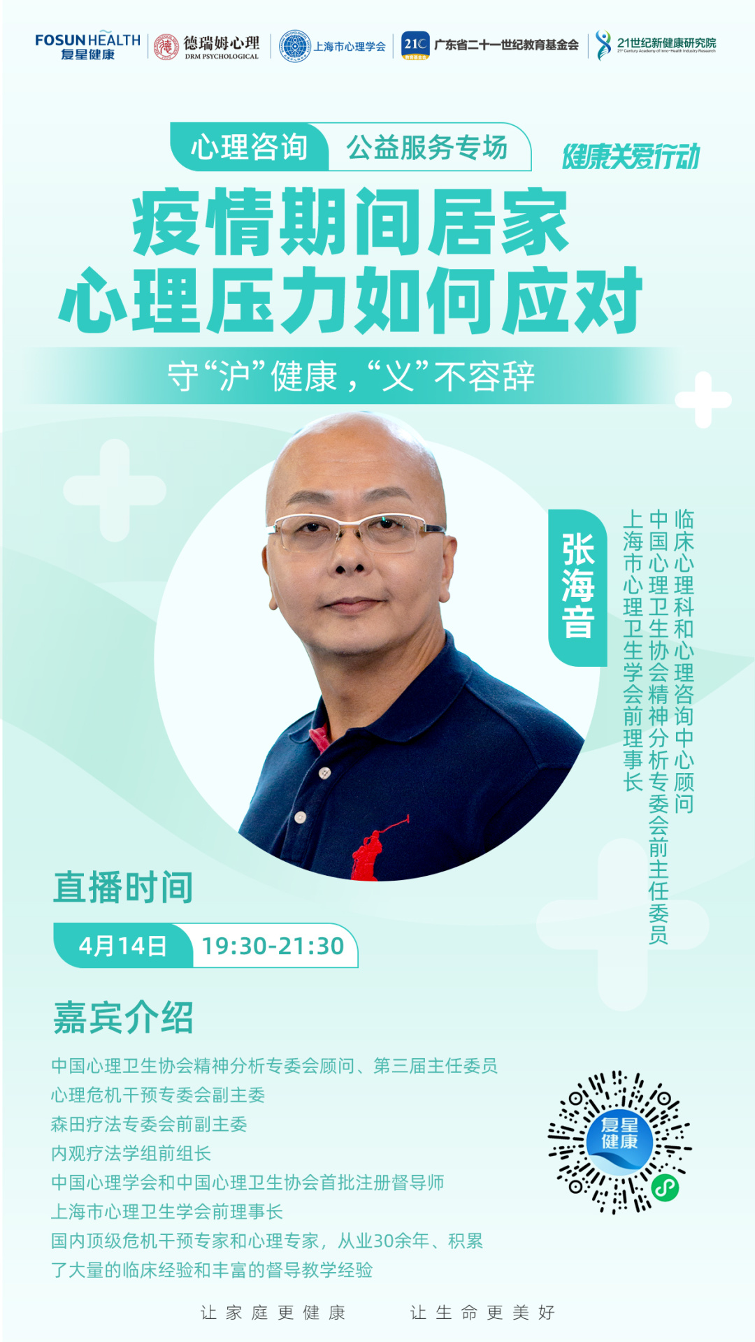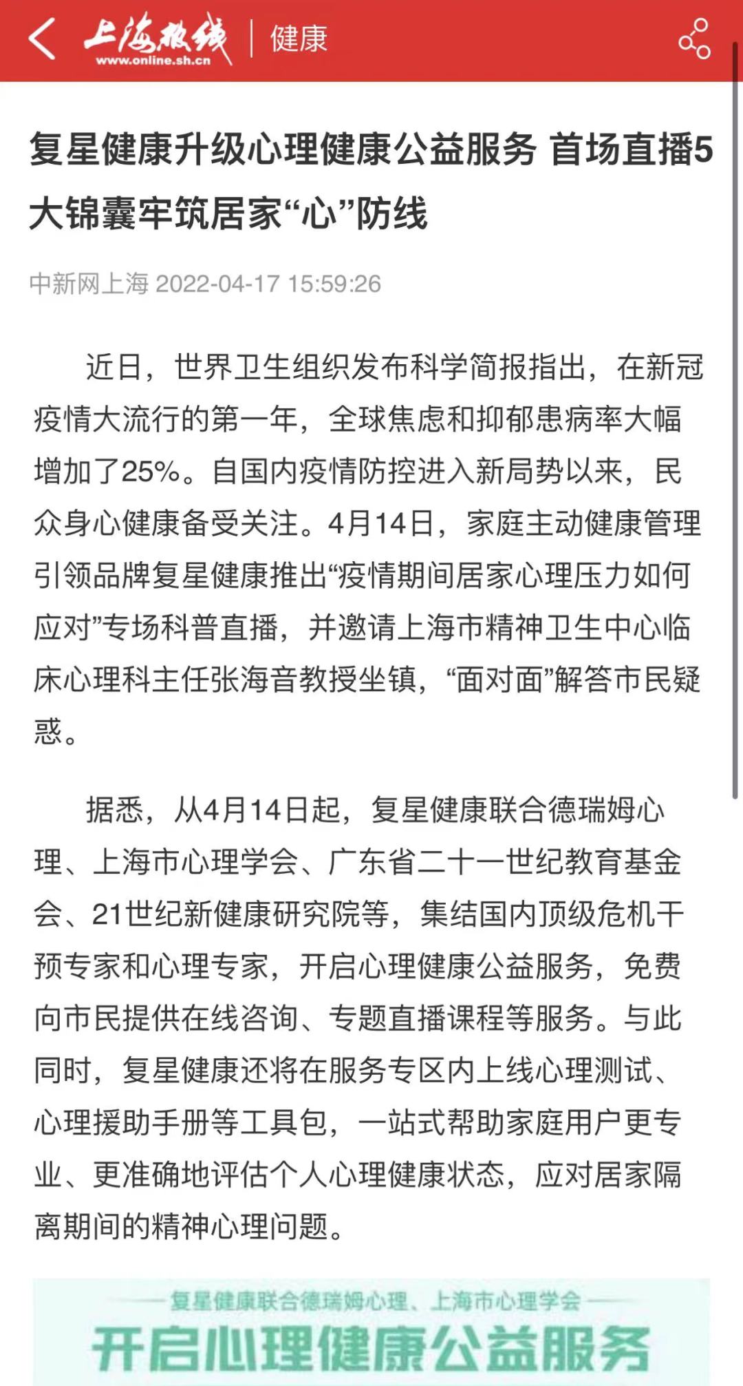 近日,平博pinnacle官网健康适时开启心理健康公益服务,携手国内顶级危机干预专家和心理专家,免费提供在线咨询、系列公益直播、专业心理测试、心理援助手册等服务,一站式帮助家庭用户更专业、更准确地评估个人心理健康状态,应对居家隔离期间的精神心理问题;另一边,药品求助平台成为疫情下上海民众的及时雨,更多媒体成为联合推广方,与平博pinnacle官网健康一起助力全市药品保障;线上公益直播大咖加盟不断升级,来自复旦大学附属中山医院肝外科副主任医师贺轶锋、复旦大学附属中山医院主任医师姜林娣、上海交通大学附属瑞金医院血液科副主任医师孙慧平、同济大学附属同济医院主任医师李萍等倾情加盟;线下,来自平博pinnacle官网健康旗下武汉济医院的两名95后医护驰援上海,奋战在高强度的核酸检测第一线。